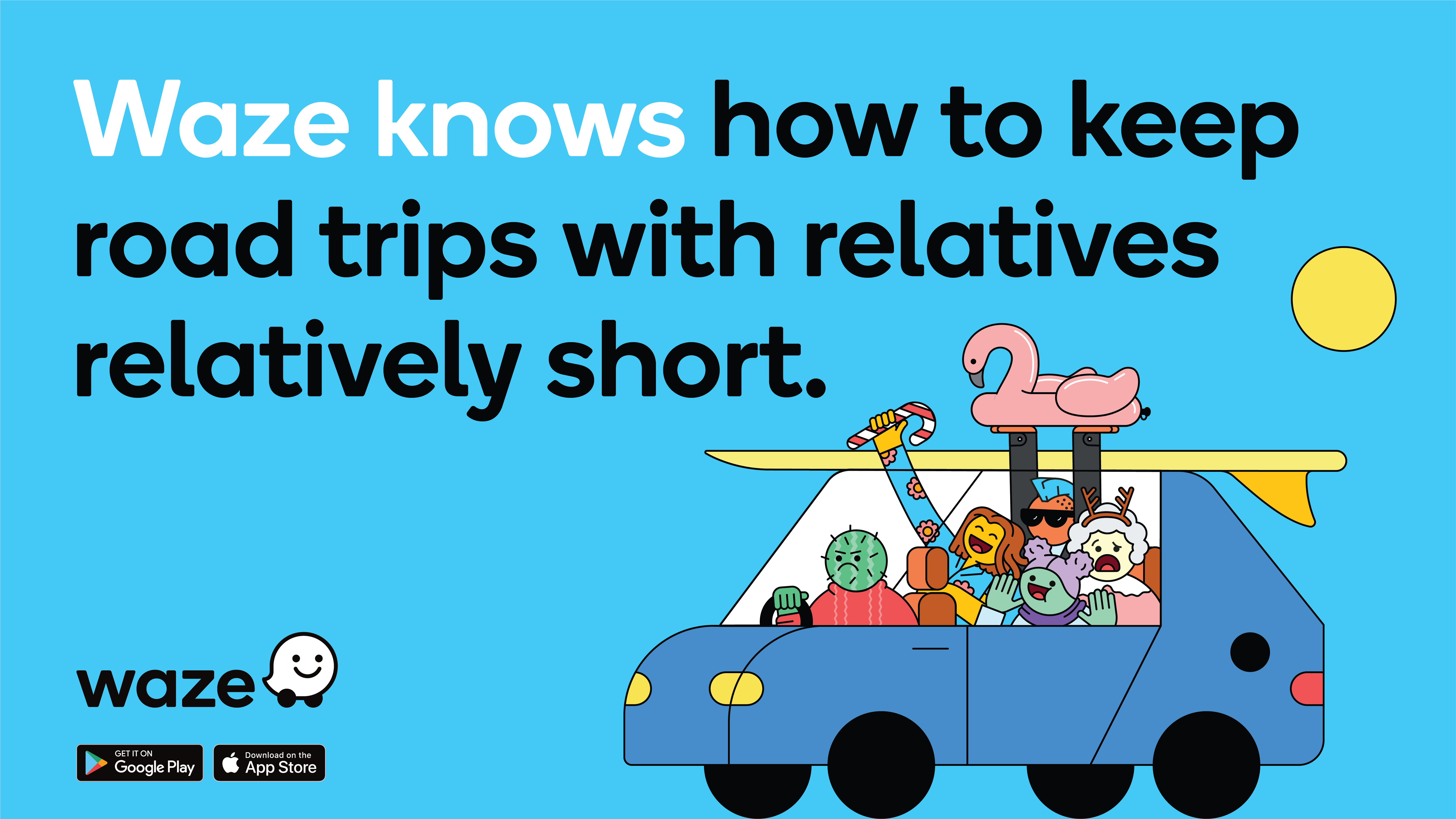 Waze came to us with an ask for a couple of billboard and mobile graphics directed toward holiday travels, and wanted us to incorporate the playfulness and joy the holiday season, all while aligning with their own established brand illustration style. I helped to design graphic illustrations for a couple of their prepared taglines.